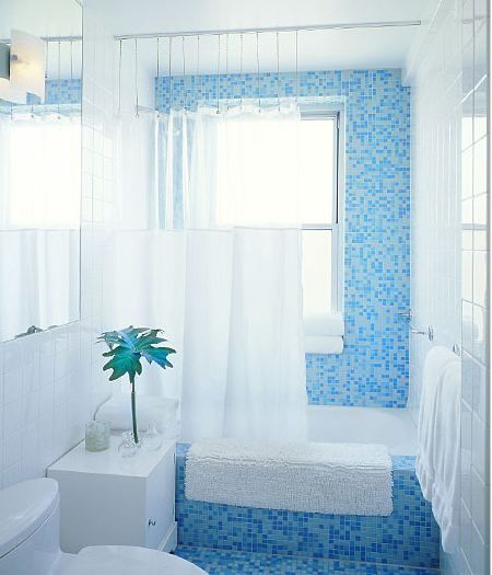 These two clean and serene bathrooms in their pretty aqua and powder-blue hues are from the personal Lower East Side residence of New York designer Andrew Suvalsky. -